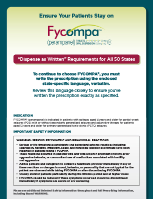FYCOMPA is a prescription medicine used alone or with other medicines to treat partial-onset seizures with or without secondarily generalized seizures in people with epilepsy aged 4 and older and with other medicines to treat primary generalized tonic-clonic seizures in people with epilepsy aged 12 and older.