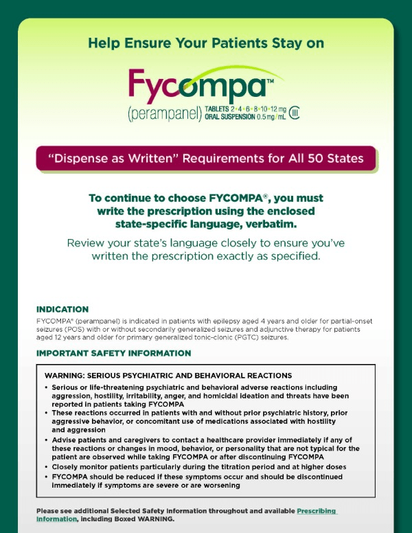 REFERENCES:  1. FYCOMPA US Prescribing Information. Coral Gables, FL: Catalyst Pharmaceuticals, Inc. 2. Schachter SC. Antiseizure drugs: Mechanism of action, pharmacology, and adverse effects. UpToDate. 2020. 3. French JA, Krauss GL, Wechsler RT, et al. Perampanel for tonic-clonic seizures in idiopathic generalized epilepsy: a randomized trial. Neurology. 2015;85(11):950-957. 4. Subbarao BS, Silverman A, Eapen BC. Seizure Medications. 2020 Jul 10. In: StatPearls [Internet]. Treasure Island (FL): StatPearls Publishing; 2021. 5. Federal Register / Vol. 78, No. 204 / Tuesday, October 22, 2013 / Proposed Rules. US Government Printing Office. 6. Doyle A and Alick S. Choosing Antiepileptic Drugs. Practical Neuro. October 2018. 7. Rogawski MA, Hanada T. Preclinical pharmacology of perampanel, a selective non-competitive AMPA receptor antagonist. Acta Neurol Scand Suppl. 2013;(197):19-24.
